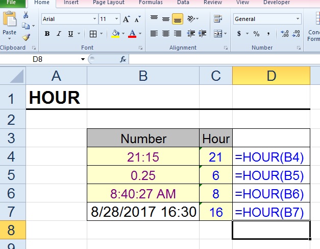 एक्सेल में Hour Function time से Hour निकालता है. Hour 0 से 23 के बीच का नंबर हो सकता है.