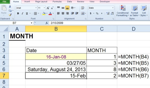 उदाहरण के लिए, अगर हमारे पास एक date है 15-April-2007, तो हम यह जानना चाहते हैं कि यहाँ कौन सा महीना है, तो हमें =MONTH(15-April-2007) का फार्मूला प्रयोग करना होगा और हमें 4 output मिलेगा, मतलब साल का चौथा महीना, जो कि अप्रैल है.