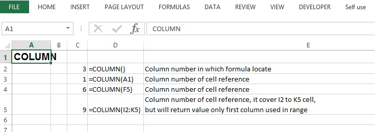 COLUMN function in excel returns column number of reference cell, if we use =column() without any cell reference then it will return column number of cell in which we have typed formula.