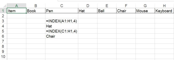 Here we have picked 4th item from data range A1:H1, which is Hat.