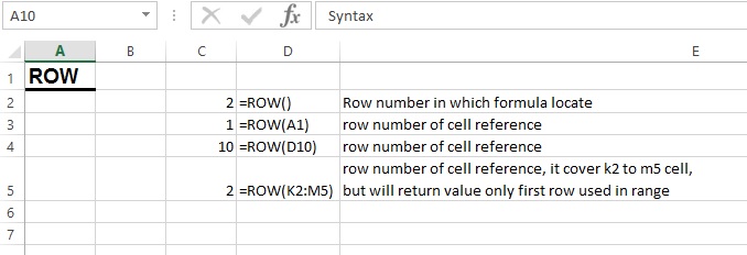 ROW function in excel returns row number of reference cell, if we use =row() without any cell reference then it will return row number of cell in which we have typed formula.