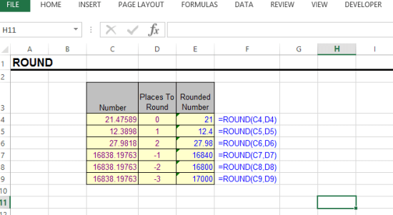 The ROUND function rounds a number to a specified number of digits. For example, if cell A1 contains 23.7825, and you want to round that value to two decimal places, you can use the following formula: