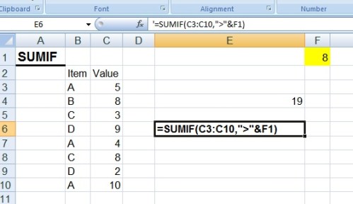 =SUMIF(C3:C10,”>”&F1) , “>”& this symbol shows that value is greater than F1 cell value.