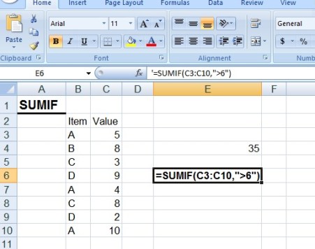 This formula will return the sum of all value in the range C3 TO C10, which value is greater than 6, that will be 35.