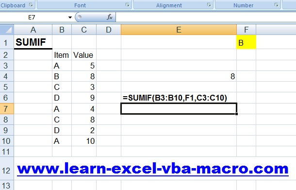Now, in below example if we type A in F1 cell then it make total of A item, if we type B in F1 Cell then it will make total of B item, means changing of item name in F1 cell sumif will make total sum for that value.
