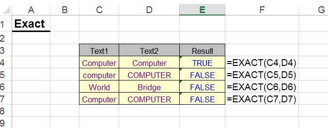 Exact function in excel compare 2 cell value. If both value is equal with upper & lower case characters then it returns True other wise it returns False. We can compare two cells value.
