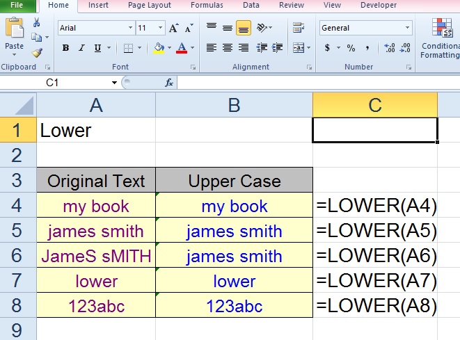 Lower Function एक सेल के सारे value को Lower case में बदल देता है.