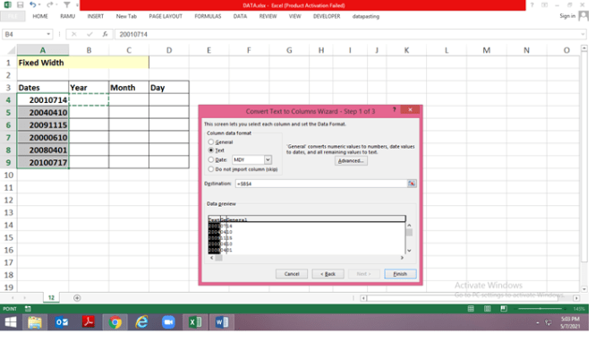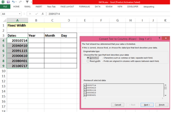 Text to Column feature का उपयोग कर , हमें वर्ष, महीना और दिन निकालना है ।