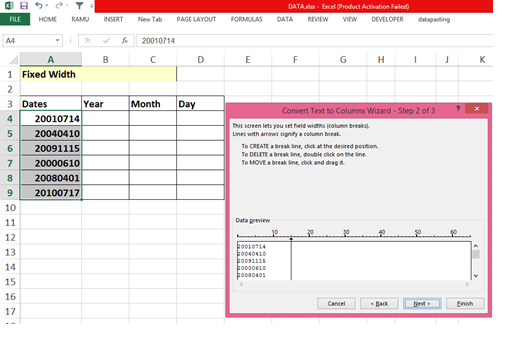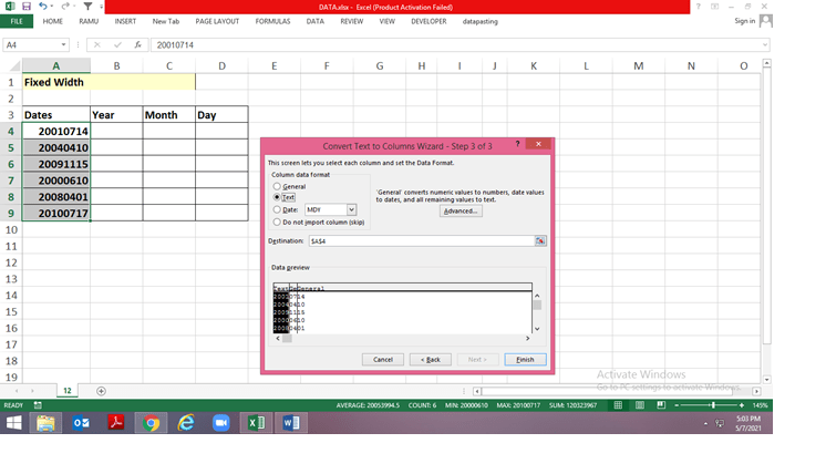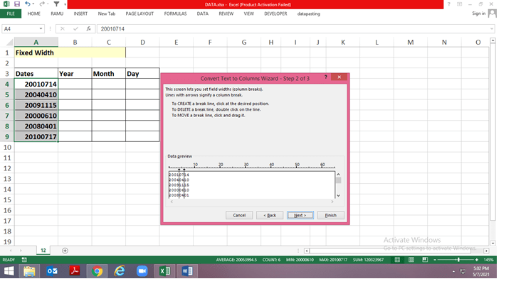 Text to Column feature का उपयोग कर , हमें वर्ष, महीना और दिन निकालना है ।