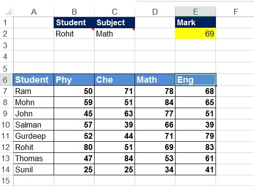 उदाहरण के लिए यदि हम B2 सेल से रोहित को चुनते हैं, और C2 सेल से विषय का नाम Math लेते हैं, तो रोहित का गणित का Mark E2 सेल में दिखेगा जो कि 69 है।